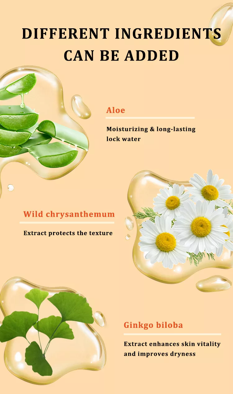 Możemy również dostosować formułę, którą chcesz, w oparciu o konkretne składniki produktu (np. główny kwas hialuronowy, niacynamid, witamina E, określone ekstrakty roślinne itp.), zapach (np. róża, biała herbata, bezzapachowy itp.) i to, czy ma działanie specjalne (np. silna naprawa, wybielanie, ujędrnianie itp.).